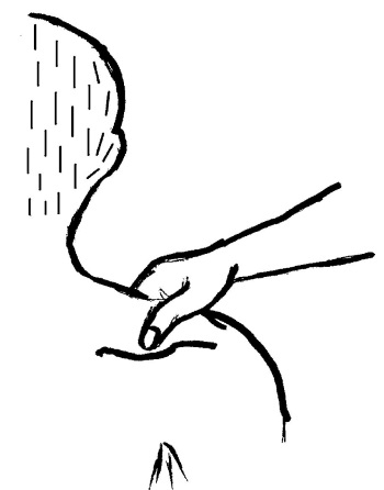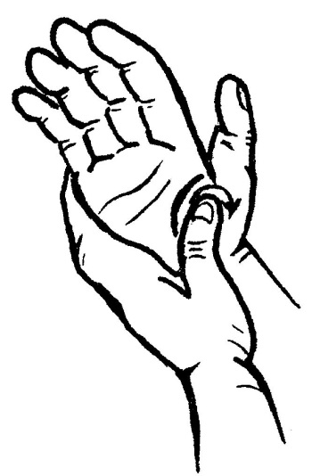 Прием пальцевого точечного массажа специальный щипцеобразный – сжатие, резкое вонзание. Данный прием применяется также с целью стимуляции, тонизирования. Выполняется несколькими пальцами (чаще вторым и первым) или одним. Проекцию точки фиксируют между пальцами (например, – ЦЗЯНЬ-ЦЗИН, или сопряженные НЭЙ-ГУАНЬ + ВАЙ-ГУАНЬ, или ДА-ЛИН + ЯН-ЧИ и другие ДА-ЧЖУН + ШЭНЬ-МАЙ), при этом выполняют вонзающие движения одновременно на соответствующие фиксируемые точки, достигая требуемого эффекта действия. Данный прием выполняют с целью купирования приступа удушья, при состоянии расслабленности, при обморочном состоянии. В некоторых рекомендациях подобные приемы сравнивают с действием клешней рака или щипцами, прием напоминает укол (рис. 14).