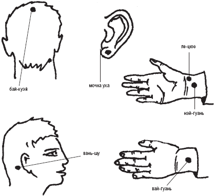 ВАНЬ-ГУ – за ухом, на 1–2 см выше границы волос над позвоночником, над мышцей, вплотную к кости.
