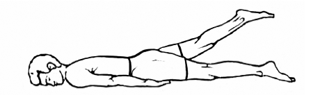 Выполнение: обопритесь на правую руку и плавно поднимите правую ногу. При этом правая сторона остается расслабленной, а основная тяжесть переносится на живот. Оставайтесь в этой позе несколько секунд и затем медленно вернитесь в И. п. Повторите то же другой ногой. Дыхание произвольное.