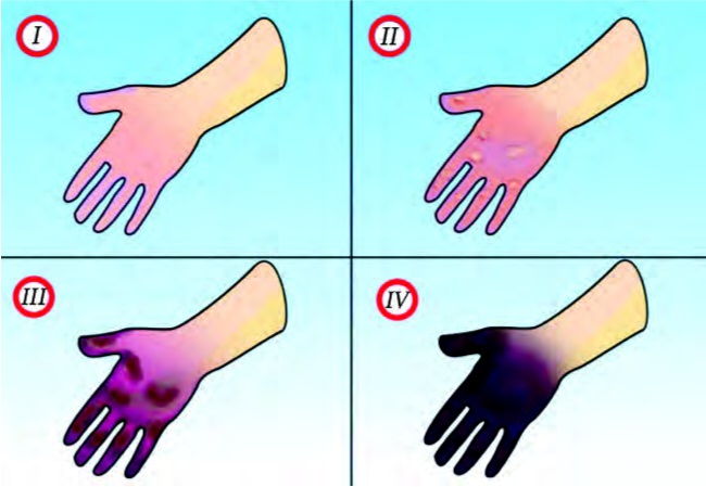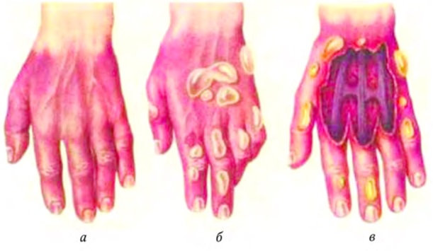 а – ожог I степени; б – ожог II, IIIa степени; в – ожог IIIб, IV степени