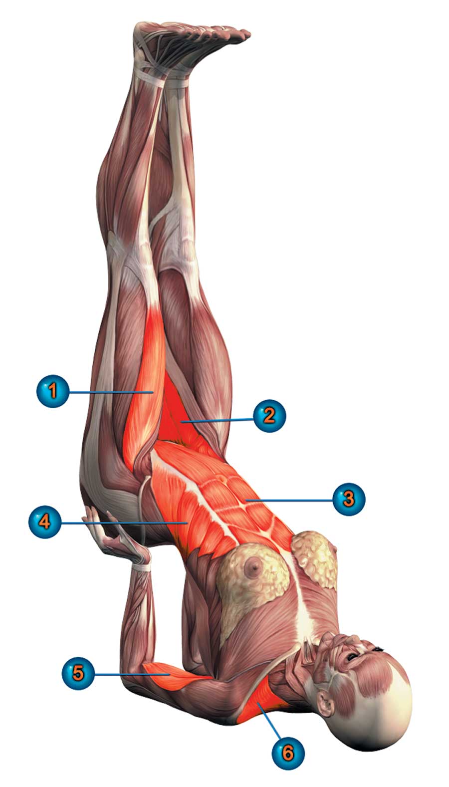 Если в сарвангасане более активно работают мышцы, выпрямляющие позвоночник, то чем ниже таз в випарита карани мудре, тем большую роль играют мышцы живота.