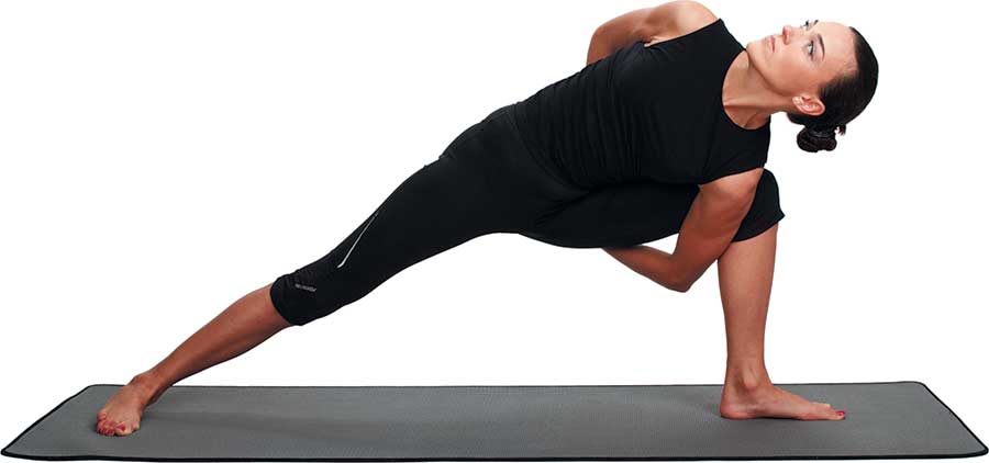 С выдохом наклоните корпус вправо, правую руку поставьте на пол с внешней стороны стопы, левую – вытяните над головой. Корпус и грудную клетку разверните в плоскости ног, касаясь правой боковой поверхностью правого бедра. Живот слегка втяните. Вытягивайте позвоночник.
