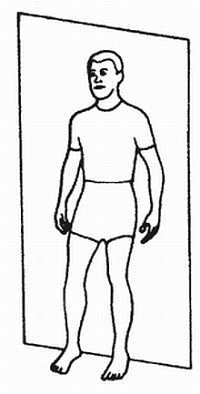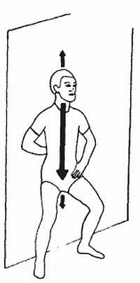 Прежде всего постарайтесь распрямить нижний отдел позвоночника и плотно прижать поясницу к стене; постарайтесь сохранить это положение как можно дольше, однако до ощущения дискомфорта. Затем положите руки на верхнюю часть бедер в местах расположения тазобедренных суставов. В этом положении вы почувствуете, насколько напряжены сухожилия передней и внутренней части бедер. Теперь немного измените положение таза так, чтобы поясничный отдел позвоночника отделился от стены. Вы немедленно почувствуете, как напряжение в сухожилиях ослабнет. Расстояние между поясничным отделом и поверхностью стены должно быть таким, чтобы туда едва можно было просунуть распрямленную ладонь. При этом угол между бедром и тазом соответственно изменится. Сохраняйте положение, чувствуя как копчик вытягивает вниз позвоночный столб.