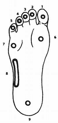 Прежде всего убедитесь в том, что подушечки больших пальцев ног находятся в плотном контакте с поверхностью пола. Затем постарайтесь как можно шире развести пальцы ног. Вес своего тела равномерно распределите так, чтобы он приходился на следующие три точки ступни: подушечку большого пальца, подушечки четвертого и пятого пальцев и середину пятки (рис. 3–2).