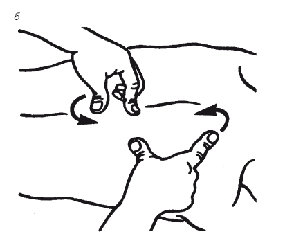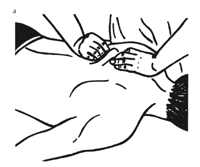 Массажист помещает левую руку на таз больного (обхватывает подвздошный гребень на левой ягодице), а ладонью правой производит винтообразные движения по направлению к позвоночнику, передвигаясь снизу вверх. Левая рука, фиксируя таз, производит легкое движение в обратную сторону. При воздействии на другой стороне позвоночника положение рук, соответственно, меняется (рис. 56-1, 56-2).