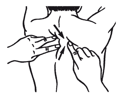 Рис. 54-2. Воздействие на промежутки между остистыми отростками позвонков. Положение сидя