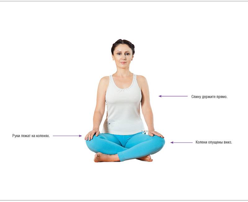 ? Скрестите ноги, сгибая правую ногу первой; положите руки на колени и выпрямите спину, опуская колени вниз, а позвоночник поднимайте вверх.