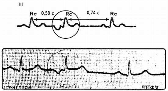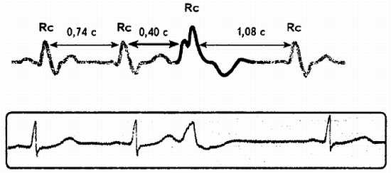 Краткая запись: неполная компенсаторная пауза. Интервал R(c)—R(э)—R(c) < интервала R(c)—R(c)—R(c).