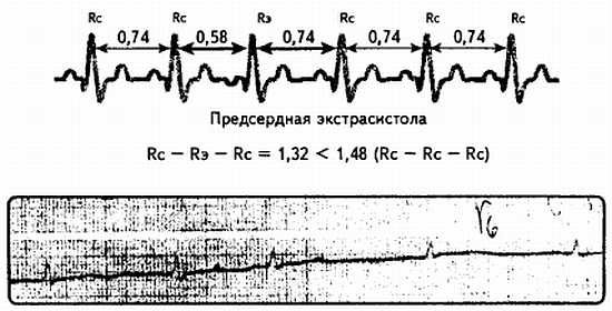 Если учесть, что предэкстрасистолический интервал всегда меньше нормального синусового интервала, то сумма пред- и постэкстрасистолических интервалов будет меньше двух нормальных интервалов R-R.