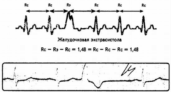 Поскольку экстрасистола — это внеочередное возбуждение, то на ЭКГ ленте месторасположение ее будет раньше предполагаемого очередного синусового импульса. Поэтому предэкстрасистолический интервал, т. е. интервал R(синусовый) — R(экстрасистолический), будет меньше интервала R(синусовый) — R(синусовый).