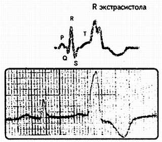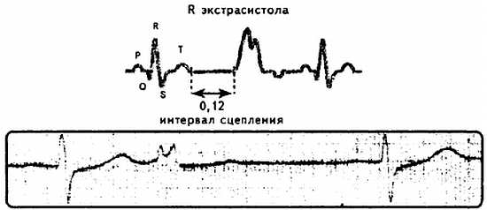 В ряде случаев интервал сцепления отсутствует, т. е. экстрасистола возникает раньше, чем закончилась стадия реполяризации. На ЭКГ при этом определяется феномен R-на-Т: экстрасистолический зубец R приходится на зубец Т предыдущего синусового комплекса. Это и есть сверхранняя экстрасистола.