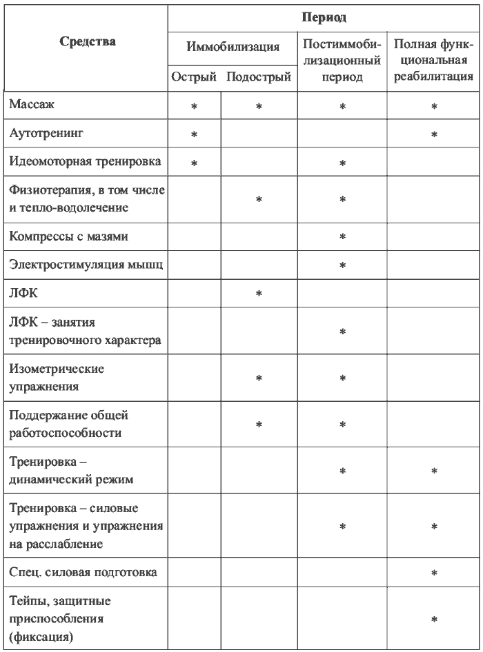 Реабилитация при травме в спорте высших достижений подразумевает применение комплексных мер: физические лечебные факторы, специальные упражнения реабилитационной направленности, психотерапию с соблюдением периодичности этапов восстановления, лекарственные средства, соответствующую диету и др. (табл. 2).