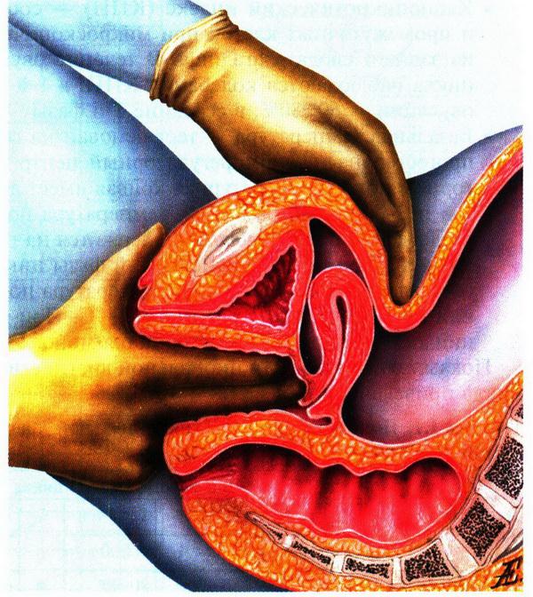 Обращают также внимание на зияние половой щели; предложив женщине потужиться, определяют, нет ли опущения или выпадения стенок влагалища и матки.