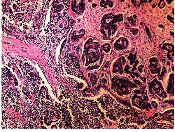 Метастатический рак яичников (опухоль Крукенберга) представляет собой метастаз из первичного очага, который чаще всего располагается в желудочно–кишечном тракте, желудке, молочной железе, щитовидной железе, матке. Метастазы из злокачественных опухолей желудочно–кишечного тракта распространяются гематогенным, ретроградно–лимфогенным и имплантационным путями. Метастазы обычно двусторонние. В 60–70% наблюдений возникает асцит. Опухоль растет очень быстро. Макроскопически метастатическая опухоль белесоватая, бугристая, на разрезе нередко волокнистая. Может быть плотной или тестоватой консистенции, что зависит от соотношения стромы и паренхимы опухоли, а также от вторичных изменений в виде отека или некроза. Микроскопически при метастатическом раке определяют перстневидные круглые клетки, наполненные слизью.