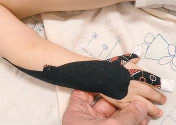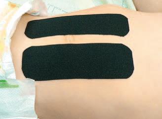 Техника тейпирования: обратим ваше внимание на то, что область живота и область спины были тейпированы тейпами II типа с целью стимуляции функции центрирования (см. рис. 15, 16). Остальная часть процедуры описания не требует, так как место постановки ясно и натяжение тейпа зависит только от ваших целей. Иногда при очень сильном натяжении, особенно у маленьких детей, место, где тейпы накладываются друг на друга (см. рис. 39, в), характеризуется выраженной неспособностью к фиксации. В таком случае можно поступить так, как сделали мы, – использовать для фиксации пластырь Hartmann Omnisilk.