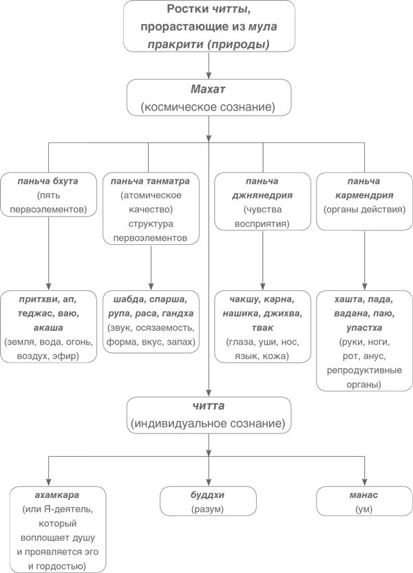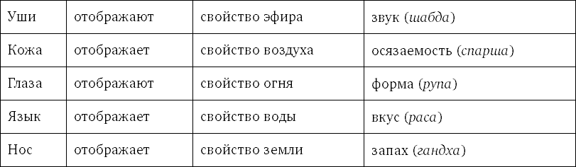 Но прежде чем рассматривать центральную роль читты в этой таблице, обратите внимание на соответствие чувств восприятия подструктурным звеньям первоэлементов природы.