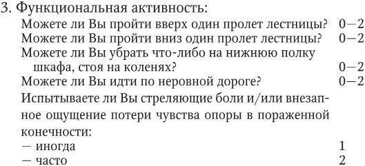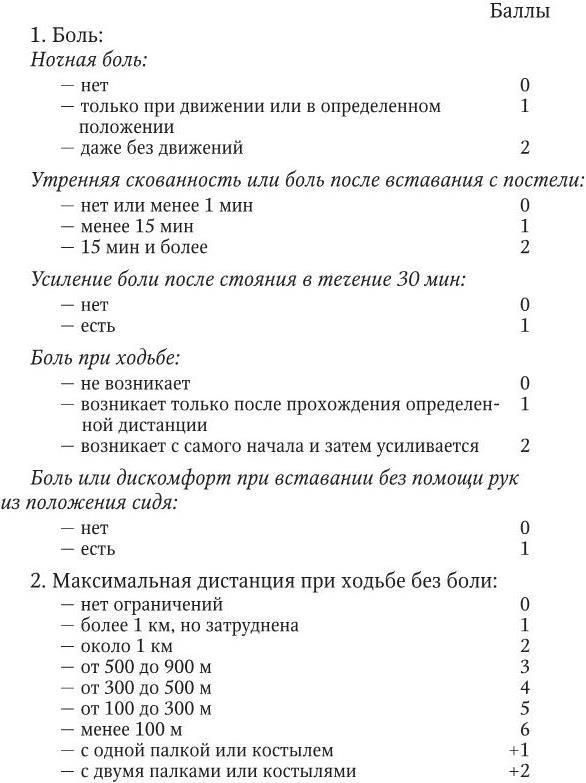 Тяжесть гонартроза: 1–4 балла — слабая; 5–7 — средняя; 8 — 10 — выраженная; 11–12 — значительно выраженная; более 12 — резко выраженная.