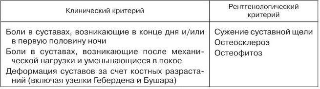 Примечание. Для постановки диагноза ОА наличие первых двух клинических и рентгенологических критериев обязательно.
