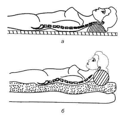 Рис. 8. Положение позвонков на твердой и мягкой постели. Позвонки находятся в нормальном положении, когда лежать на твердой и ровной постели с твердой подушкой (а), и искривляются, когда лежат на мягкой постели с высокой подушкой (б)