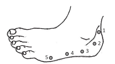 4. Книзу от головки 5-й плюсневой кости, на границе тыльной и подошвенной поверхности стопы можно прогреть лечебную зону (4) при заболеваниях позвоночника (напряжение в затылочных мышцах, боли в пояснице, спине, задней поверхности нижних конечностей, боль в тазобедренном суставе).