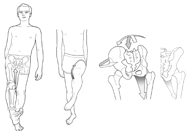 • Комбинация антеверсии, наклона и поворота таза (два последних движения производятся в сторону, противоположную сокращению мышцы).