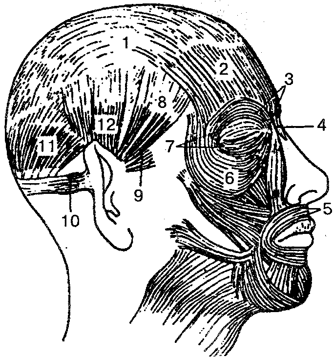 1 — сухожильный шлем; 2 — затылочно-лобная мышца; 3, 6,7 — круговая мышца глаза; 4 — мышца гордецов; 5 — круговая мышца рта; 8 — височно-теменная мышца; 9 — передняя ушная мышца; 10— задняя ушная мышца; 11 — затылочно-лобная мышца; 12— верхняя ушная мышца