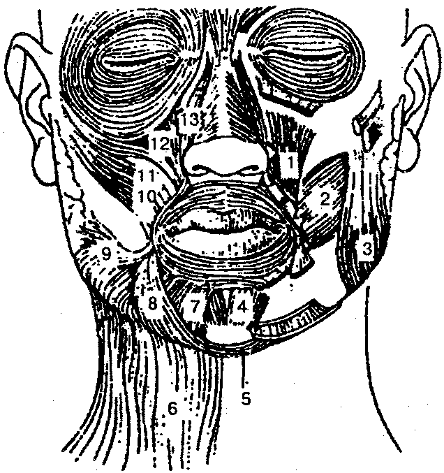 1 — мышца, поднимающая угол рта; 2 — щечная мышца; 3 — жевательная мышца; 4 — подбородочная мышца; 5 — поперечная мышца подбородка; б— подкожная мышца шеи; 7— мышца, опускающая нижнюю губу; 8— мышца, опускающая угол рта; 9 — мышца смеха; 10 — большая скуловая мышца; // — малая скуловая мышца; 12 — мышца, поднимающая верхнюю губу; 13— мышца, поднимающая верхнюю губу и крыло носа