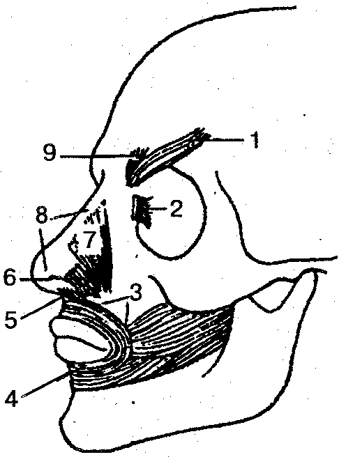 1 — мышца, сморщивающая бровь-2— слезная часть круговой мышцы глаза; 3 — краевая часть круговой мышцы рта; 4 — губная часть круговой мышцы рта; 5— мышца, опускающая перегородку носа; 6 — крыльная часть носовой мышцы; 7— поперечная часть носовой мышцы; 8 — носовая мышца; 9 — мышца, опускающая бровь