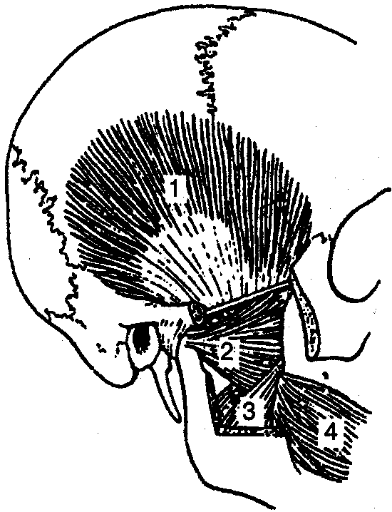 1 — височная мышца; 2 — латеральная крыловидная мышца; 3 — медиальная крыловидная мышца; 4 — щечная мышца