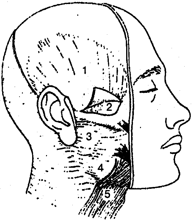1 — височная фасция; 2 — глубокая пластинка височной фасции; 3— фасция околоушной железы; 4 — жевательная фасция; 5 — подкожная мышца шеи