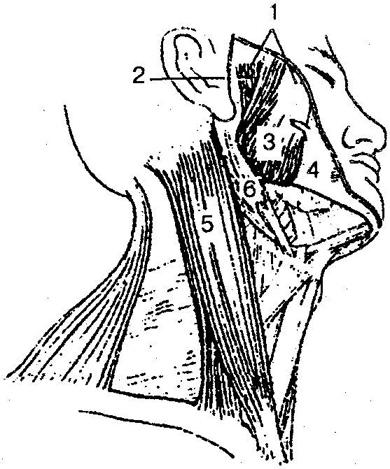 1— жевательная мышца; 2 — глубокая часть жевательной мышцы; 3 — поверхностная часть жевательной мышцы; 4 — щечно-глоточная фасция; 5—грудино-ключично-сосцевидная мышца; 6— двубрюшная мышца