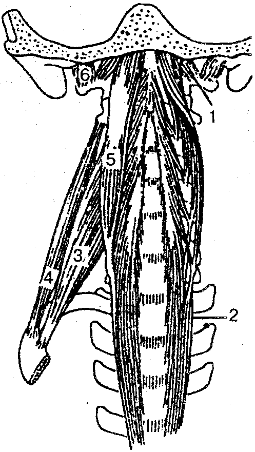 1 — передняя прямая мышца головы; 2 — длинная мышца шеи; 3 — передняя лестничная мышца; 4— средняя лестничная мышца; 5—длинная мышца головы; 6— латеральная прямая мышца головы