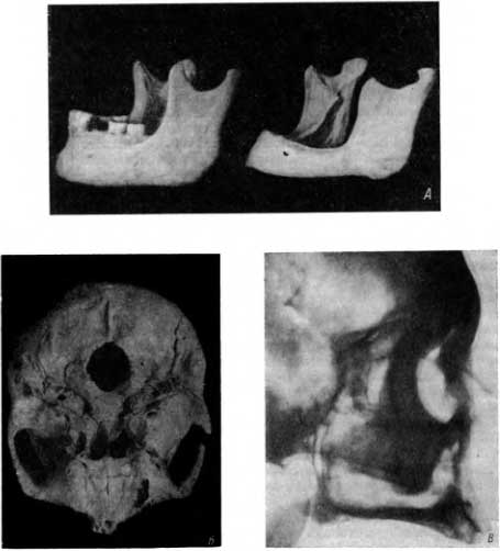 Рис. 54. А — атрофия беззубой нижней челюсти (Саркел, X–XII вв.), слева — нормальная челюсть; Б — атрофия альвеолярного края верхней челюсти (Саркел, X–XII вв.); В — атрофированная верхняя челюсть в рентгеновском изображении.