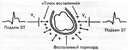 Воспаление перикардиальной сорочки меняет ее электрическое состояние, что приводит к формированию так называемых «токов воспаления», которые направлены от сердца.