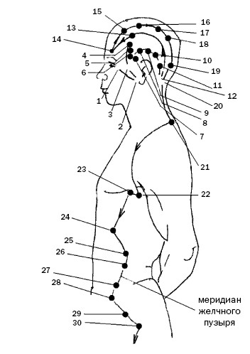 14. Ян-бай («белизна Ян») расположена выше середины брови на 1 цунь. Показания для простукивания: головная боль, головокружение, рвота; спазм мимических мышц; снижение сумеречного зрения, слезотечение; невралгия тройничного нерва, паралич лицевого нерва; нарушение сна.