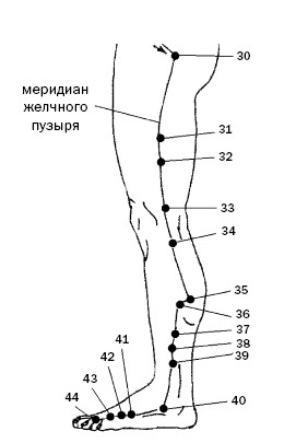34. Ян-лин-цюань («родник у холма на наружной стороне колена») расположена под коленом, на внешней стороне голени. Показания к простукиванию: заболевания печени и желчного пузыря; отрыжка, привычный запор; головокружение, атеросклероз; отеки; судороги мышц нижней конечности; лечение колена, поясницы, болей в тазобедренном суставе.