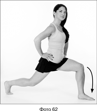 3. Медленно отводите правую ногу назад и опускайтесь корпусом, пока бедра не будут параллельны левому колену. Левое колено должно быть над лодыжкой, а правое – почти касаться пола (см. фото 62). Держите корпус вертикально.