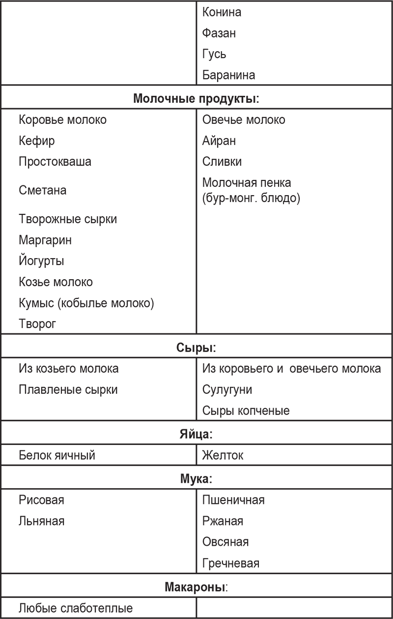 Таблица № 5. Распределение продуктов от ИНЬ (-) к ЯН (+) Дж. Осава