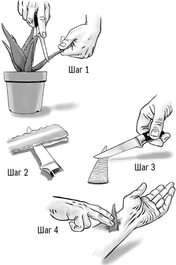 Сок растения алоэ использовали для лечения поражений кожи тысячелетиями. Чтобы изготовить снадобье на скорую руку, отрежьте лист у основания (шаг 1). Острым ножом разрежьте лист вдоль и разделите его на две половинки (шаг 2). Сделайте в одной из половинок горизонтальные и вертикальные надрезы, чтобы вытекал сок (шаг 3). Приложите ее к пораженной области (шаг 4). Повторяйте процедуру несколько раз в день.