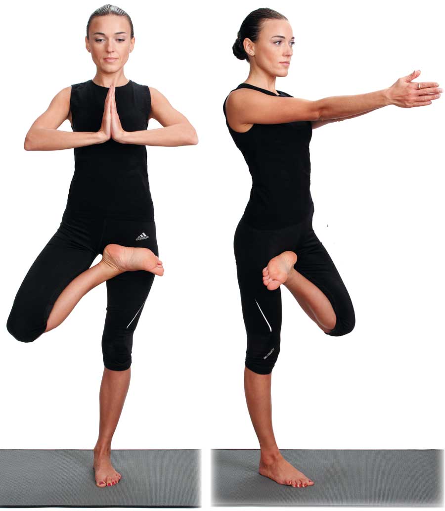Можно использовать другой вариант. Положите левую ступню на бедро с помощью рук. Для этого поднимите согнутую в колене левую ногу, захватите лодыжку левой рукой. Помогая себе рукой, поставьте левую ступню как можно выше на внутреннюю часть бедра. Следите за тем, чтоб пальцы стопы при этом были направлены четко вниз. Левое колено отведите назад. Бедра при этом располагайте в одной плоскости.
