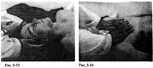 Теперь делайте массаж задних мышц шеи, особенно в области вышеупомянутых точек. Во время массажа пациенту следует слегка отвести голову назад, чтобы расслабить мышцы. Начиная от основания черепа большими пальцами делайте прижимающие и выталкивающие движения вниз вдоль мышц шеи по обе стороны позвоночника. Можно поменять положение рук. Одной рукой несильно нажимайте на лоб пациента, удерживая его голову, а ребром ладони другой руки мягко растирайте заднюю часть шеи книзу (рис. 5-46). Повторите 10 раз.
