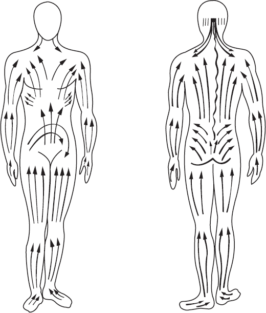 8. Учитывая анатомо-физиологические особенности человеческого организма, мы делим тело условно на две части: до пояса и ниже пояса. Все движения должны производиться по кроволимфотоку, то есть в направлении крупных лимфоузлов, которые расположены в подмышечных впадинах и в паховых складках. (см. рис. 1).