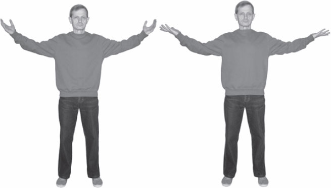 Развести руки в стороны так, чтобы кончики пальцев были примерно на уровне ушей. Получается положение, похожее на форму I.7, только ладони не сжаты в кулаки. Они направлены вперед и вверх.