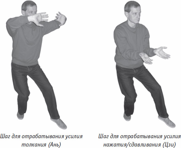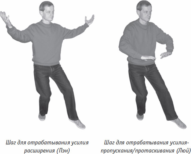 Положения, в которых выполняется хождение по кругу, отличаются в различных стилях Ба-Гуа. Ниже приведены формы для шагов, в которых отрабатываются четыре (из восьми) основных усилий в Тай-Цзи-Цюань. Эти усилия называются «четырьмя сторонами» и соответствуют Северу, Югу, Западу и Востоку на схеме восьми триграмм. Еще их называют четырьмя «гражданскими», или алхимическими, усилиями, более предназначенными для сохранения здоровья, чем для воинского применения.
