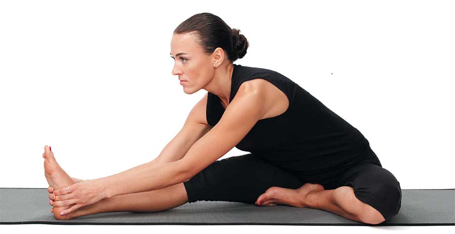Согните левую ногу в колене таким образом, чтобы левая стопа оказалась прижата к промежности пяткой. Бедро отведите в сторону, колено положите на пол. Следите за тем, чтобы между прямой и согнутой ногами был угол 90°. Затем слегка наклоните корпус вперед. Корректируйте положение таза и ягодиц и захватите стопу правой ноги руками.