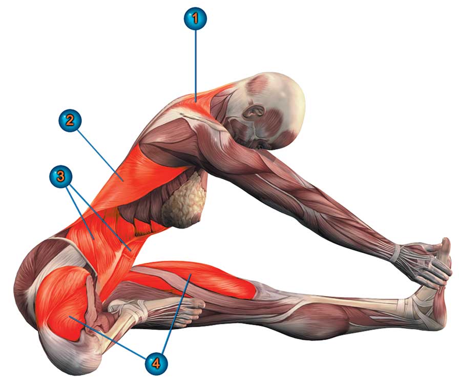 Растягиваются: 1 – трапециевидная мышца, 2 – широчайшая мышца спины, 4 – четырехглавая мышца бедра выпрямленной ноги;