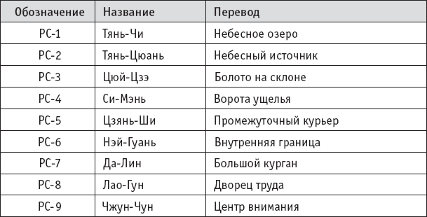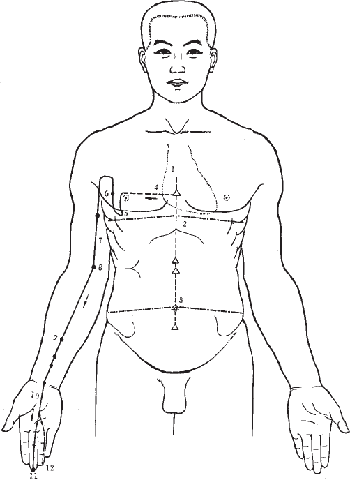 Другая внутренняя ветвь идет вбок от Перикарда, пересекает грудь и выходит на поверхность около соска (точка РС-1). Отсюда внешний путь меридиана продолжается к подмышечной впадине, поворачивает вниз и опускается по середине внутренней поверхности руки, доходя до ладони. Заканчивается меридиан на лучевой стороне кончика среднего пальца (точка РС-9). Короткая ветвь отходит от основного меридиана на ладони и идет к концу четвертого (безымянного) пальца, где соединяется с меридианом Тройного обогревателя.
