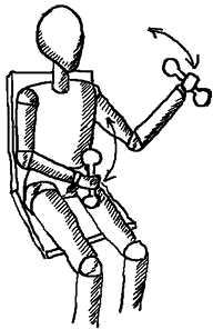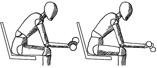 6. ИП: сидя на стуле. Предплечья расположены на бедрах таким образом, чтобы кисть могла опускаться за колено. Ладонь руки обращена вниз. В руке – небольшая гантель или диск весом 0,5 кг. При выполнении упражнения необходимо немного согнуться вперед в талии с небольшим разгибанием спины. Поднимать и опускать груз, сохраняя предплечье неподвижным, разгибая только запястье. При выполнении этих упражнений необходимо обратить внимание на осанку, не горбиться (рис. 6.11).