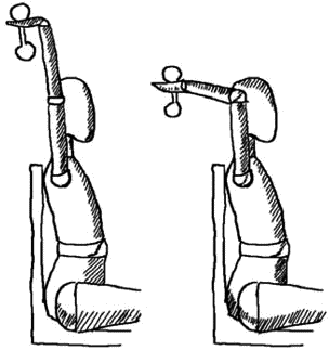4. ИП: сидя, прислонившись к спинке стула. Отягощение (гантель или диск) взять двумя руками и расположить его позади головы. Стараться держать руки позади головы. Поднять вес, выпрямляя руки. Опустить вес аккуратно и медленно (концентрическое мышечное сокращение должно быть быстрее, чем эксцентрическое). Это упражнение способствует увеличению силы трицепсов (рис. 6.9).