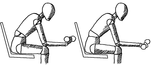 3. ИП: сидя, прислонившись к спинке стула. Ноги установить на ширине плеч. В руки взять гантели или диски весом 0,5–2 кг. Локти упираются в туловище. По очереди сгибать и разгибать руки в локтевых суставах. Это упражнение направлено на увеличение силы бицепсов (рис. 6.8). Поднимать вес необходимо быстрее, чем опускать (концентрическое мышечное сокращение должно быть более быстрым, чем эксцентрическое).